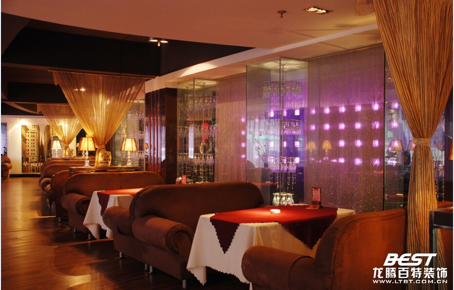 咖啡廳的空間設(shè)計要與其總體設(shè)計風(fēng)格相匹配。在空間布置上可通過虛的手法遮擋視線,似隔非隔,隔中有透,實(shí)中有虛。例如利用布慢、漏墻、珠簾、屏風(fēng)、籬笆、木柵等緩沖通道與視線;又如,利用通道的回繞曲折相通,不使人一目了然。適當(dāng)?shù)姆指暨€可知足部門客人不想被打攪的心理,這就是所謂的“園必隔”。